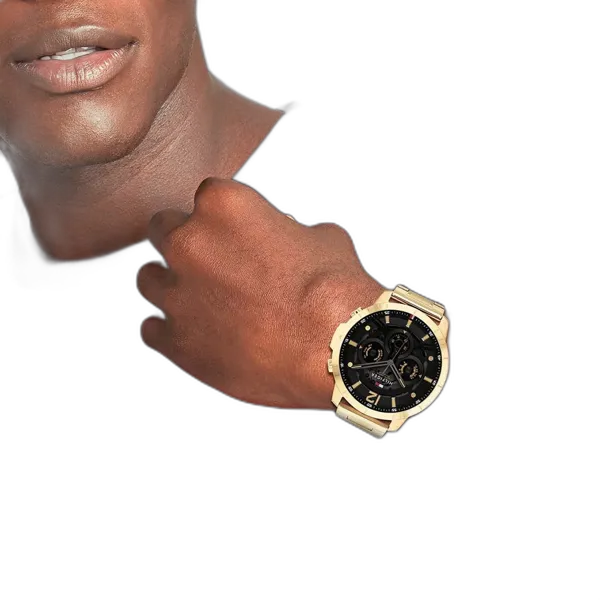 Elevate your style with this original Tommy Hilfiger watch. This authentic timepiece, reference 1710511 (Luca model), features a sleek black dial paired with a premium gold-tone stainless steel bracelet.