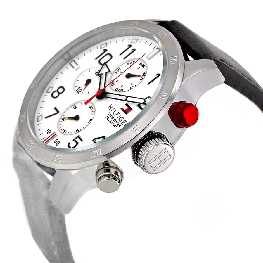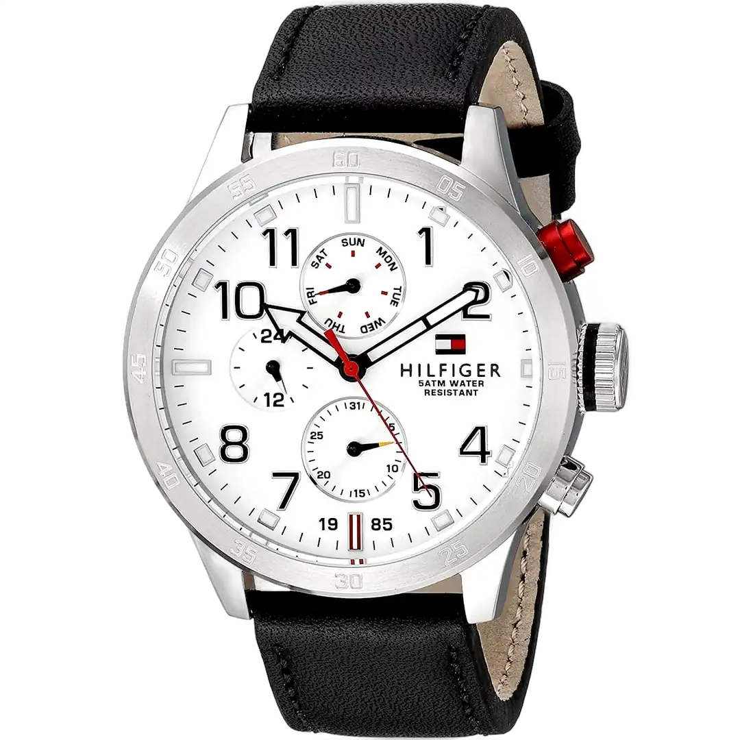 Step into the world of iconic American fashion with the Tommy Hilfiger watch, a perfect blend of classic elegance and modern sophistication. Renowned for its high-quality craftsmanship and distinctive designs, Tommy Hilfiger delivers with this authentic watch, reference 1791138, also known as the Trent model (Factory number TH.248.1.14.1821). Featuring a clean white dial and a luxurious black genuine leather strap, this timepiece offers a refined and versatile look, ideal for the modern man who values style and functionality. Its water resistance up to 50 meters ensures it can handle everyday activities, including light swimming, though not recommended for deep diving or high-impact water sports. The watch features a multifunction quartz movement with three sub-dials, a date window, and a 24-hour indicator, adding practicality and elegance to its sophisticated design, making it a perfect companion for both professional and casual settings.