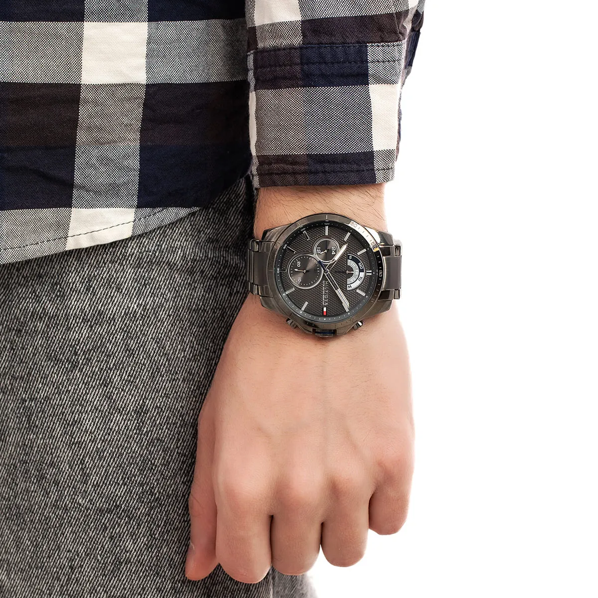 The core aesthetic of the Tommy Hilfiger 1791347 Watch is defined by its strong dark metallic effect and functional detailing. The round case (typically 46mm or similar) is crafted from durable stainless steel and finished with a uniform, polished Gunmetal-Tone plating (Dark Grey PVD). The focal point is the captivating Grey Dial, which provides a rich, sophisticated backdrop. This model is a functional chronograph, housing sub-dials that typically measure minutes, seconds, and 24-hour time, lending it a dynamic, race-inspired feel. The dial is accented with subtle markers and the brand’s signature flag logo, confirming its American heritage against the dark background. The overall monochromatic hue gives the watch a unique, modern elegance.