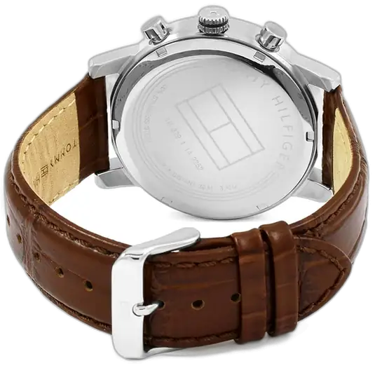 The core aesthetic of the Tommy Hilfiger 1791400 Watch is defined by the classic contrast of white and brown. The round case (typically 44mm or similar) is crafted from durable stainless steel with a polished finish, often silver-tone. The focal point is the sophisticated White Dial, which provides a sharp, highly legible backdrop. This model typically features a simple, clean dial layout with three hands and a subtle date window, emphasizing its minimalist elegance. The dial is accented with the brand’s signature red, white, and blue flag logo, confirming its American heritage. The hour markers are typically simple stick indices or numerals, ensuring clarity and readability against the white background.