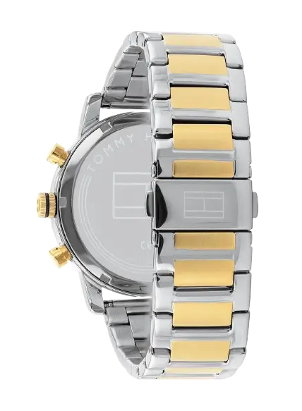 The bracelet of the Tommy Hilfiger Kane Watch 1791539 is its key element for strength and high metallic versatility. It is a robust link Stainless Steel Bracelet showcasing a refined Two-Tone finish, expertly blending Silver-Tone outer links with Gold-Tone central links. This metallic duality allows the watch to be paired flawlessly with both silver and gold accessories. The bracelet secures with a folding clasp, ensuring safety and ease of use. For practical daily assurance, the watch maintains a rating of 50 Meters (5 ATM) of water resistance, offering appropriate protection against moisture and splashes. The powerful combination of the deep black dial and the sophisticated two-tone bracelet makes the Tommy Hilfiger 1791539 Watch an instantly appealing symbol of functional luxury.