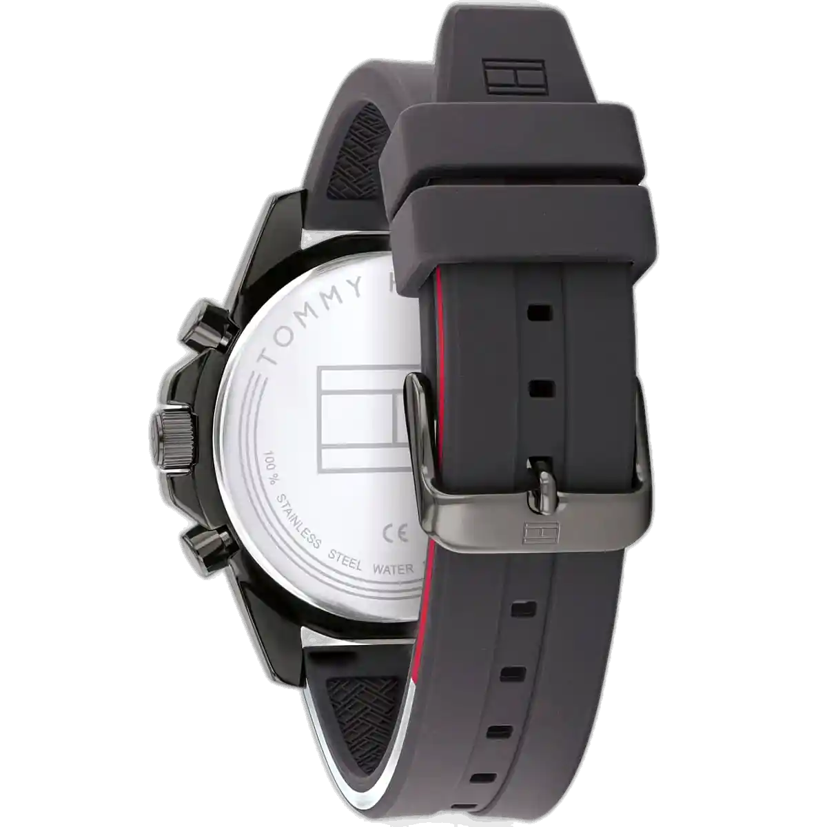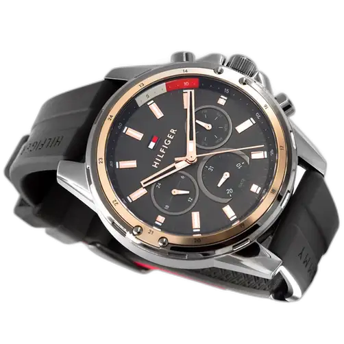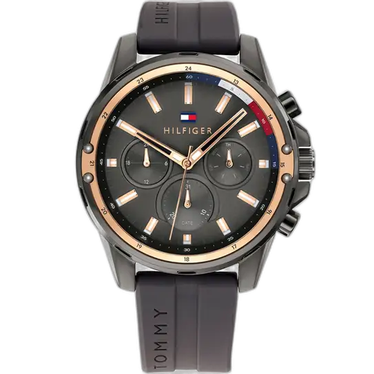 The strap of the Tommy Hilfiger Mason Watch 1791792 is its key element for comfort and strength. It is a highly robust Grey Silicone (Rubber) Strap. This material is ideal for active and sporty wear, as it is water-resistant, easy to clean, and provides a comfortable, light feel on the wrist. The monochromatic grey strap perfectly complements the dark case, enhancing the watch’s sleek, athletic aesthetic. The strap secures with a classic buckle clasp. For superior practicality, the watch maintains a rating of 50 Meters (5 ATM) of water resistance, offering appropriate protection against moisture and splashes. The powerful combination of the bold case and the comfortable silicone strap makes the Tommy Hilfiger 1791792 Watch an instantly appealing symbol of functional luxury.