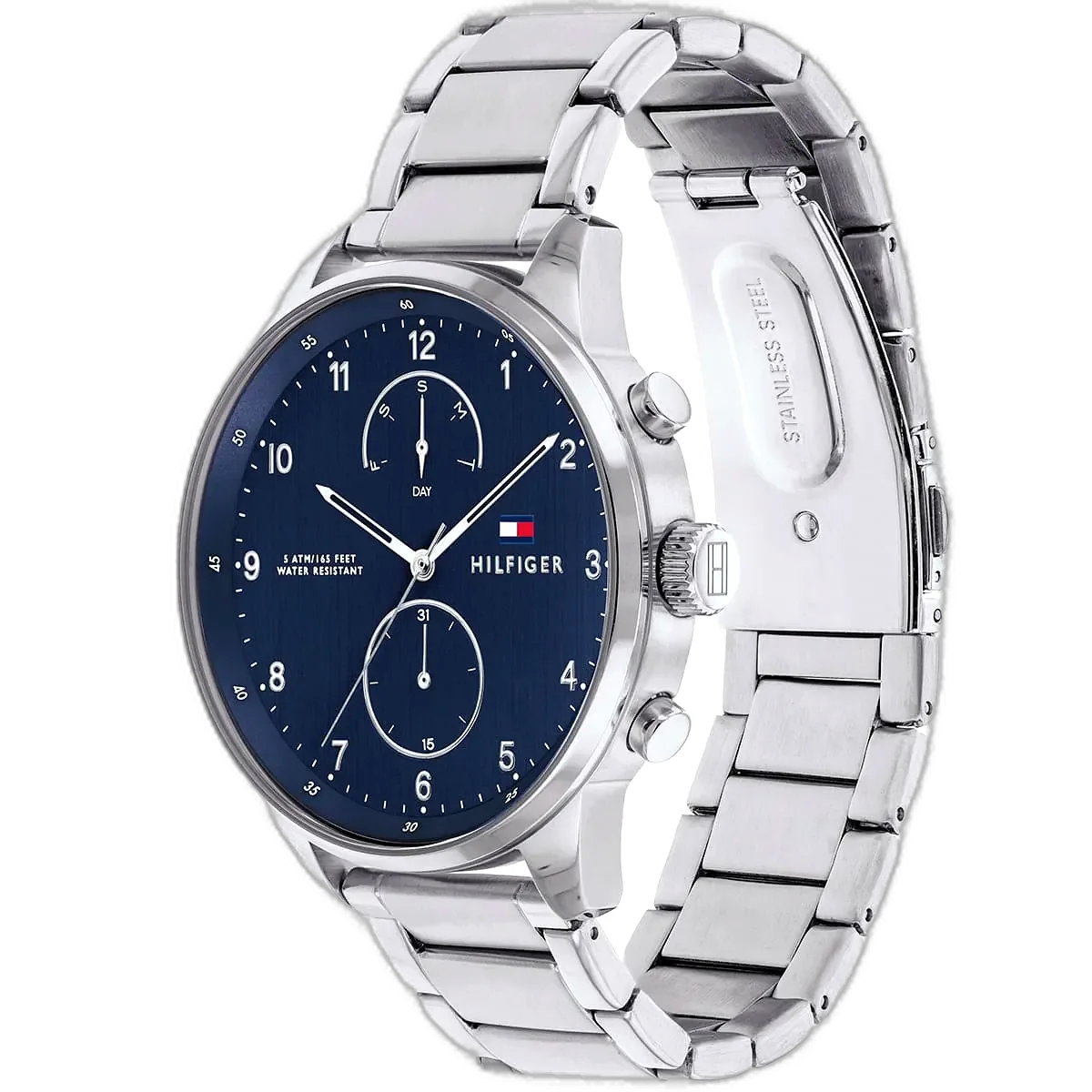 Embrace a classic, sophisticated look with this original Tommy Hilfiger watch. This authentic timepiece, reference 1791575 (Chase model), features a striking blue dial and a timeless silver-toned stainless steel strap.