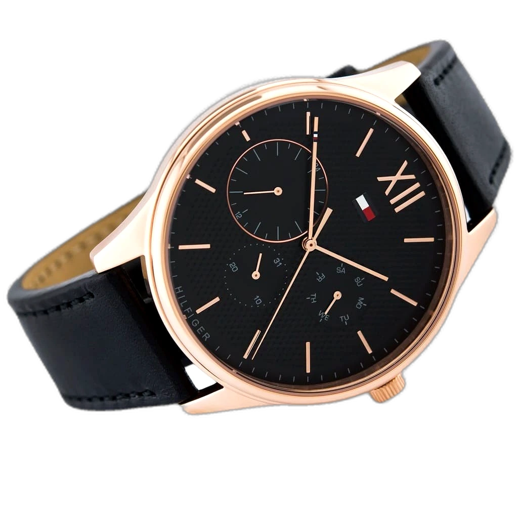 Step into the world of iconic American fashion with the Tommy Hilfiger Damon watch, a perfect blend of modern sophistication and everyday versatility. Renowned for its high-quality craftsmanship and distinctive designs, Tommy Hilfiger delivers with this authentic watch, reference 1791419 (Factory number TH.344.1.34.2326). With its sleek black dial and a timeless black genuine leather strap, this timepiece offers a bold and refined look that is ideal for the modern man who values both style and functionality. Its water resistance up to 50 meters ensures it can handle daily activities, including light swimming, though it is not recommended for deep diving or high-impact water sports. The watch features a multifunction quartz movement with three sub-dials, including day, date, and a 24-hour indicator, adding practicality and elegance to its dynamic design, making it a perfect companion for both professional and casual settings.