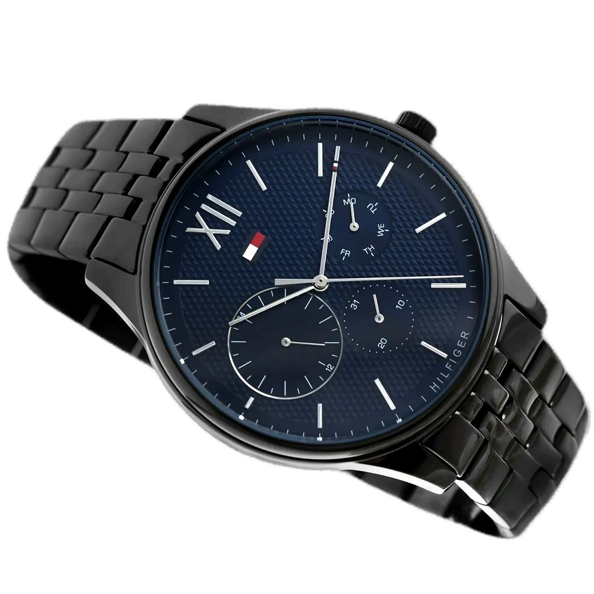 Experience timeless style with this original Tommy Hilfiger watch. This authentic timepiece, reference 1791454 (Damon model), features a sophisticated blue dial and a sleek black stainless steel strap.
