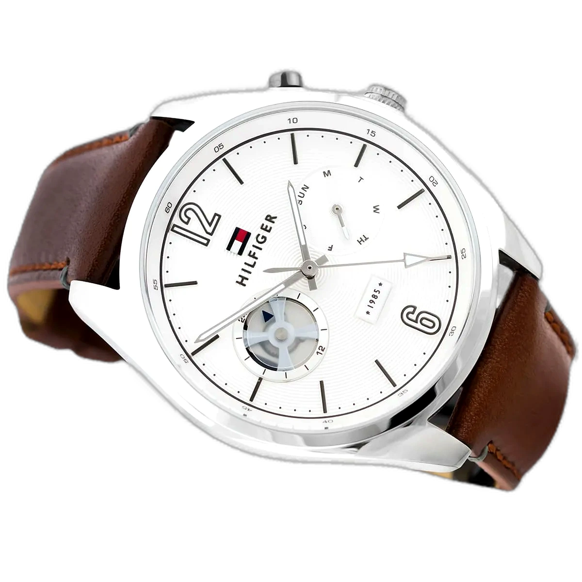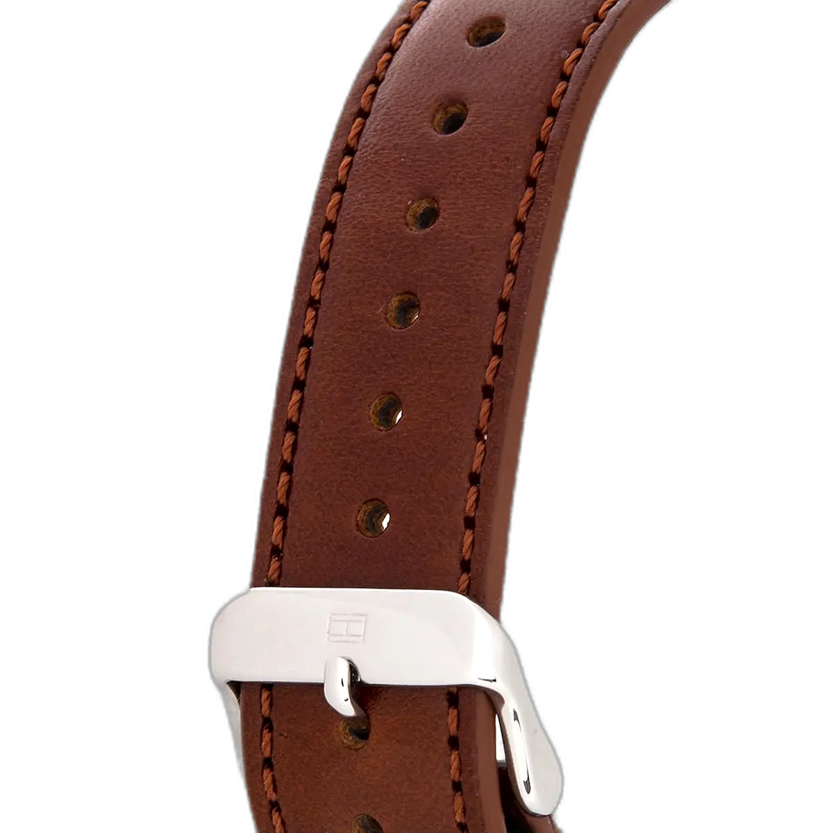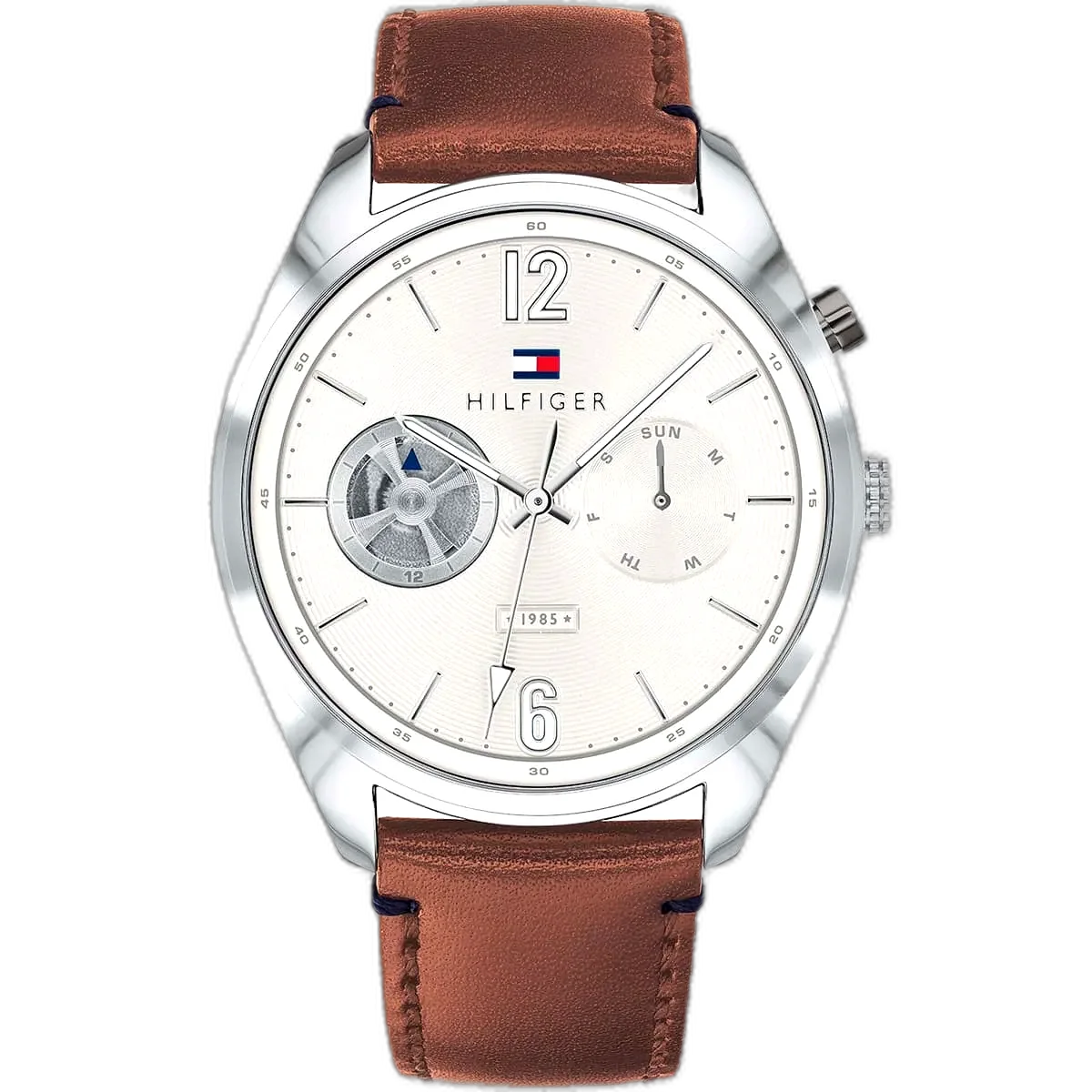 Embrace a classic, sophisticated look with this original Tommy Hilfiger watch. This authentic timepiece, reference 1791550 (Deacan model), features a refined silver dial and a timeless brown genuine leather strap.