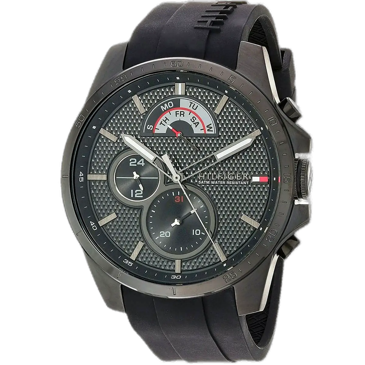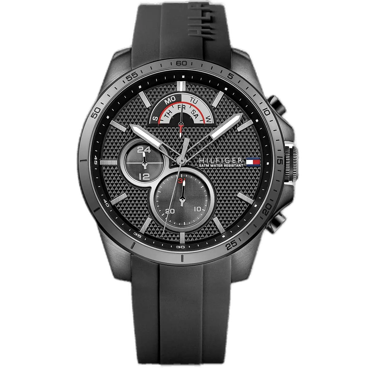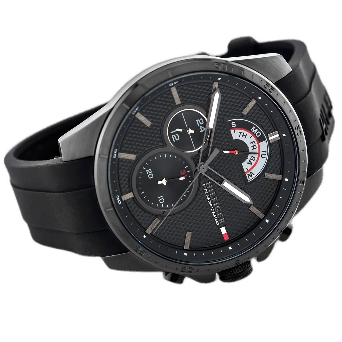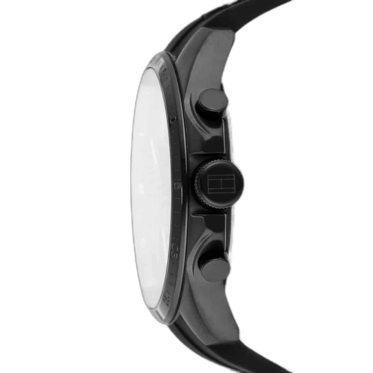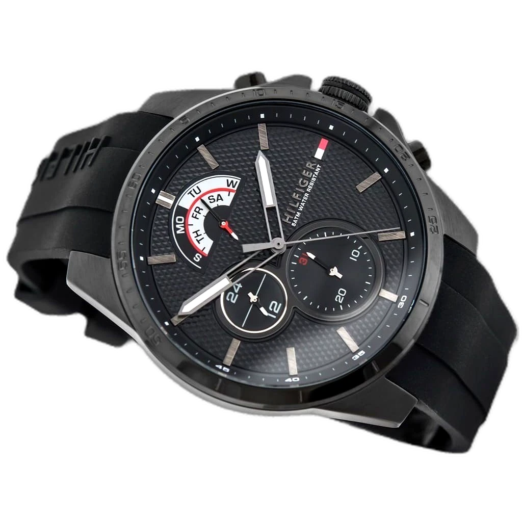 Embody modern American luxury with this original Tommy Hilfiger watch. This authentic timepiece, reference 1791352 (Decker model), features a sophisticated black dial and a matching black silicone strap.