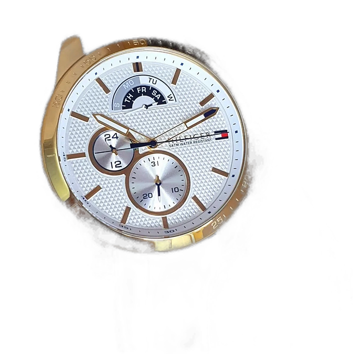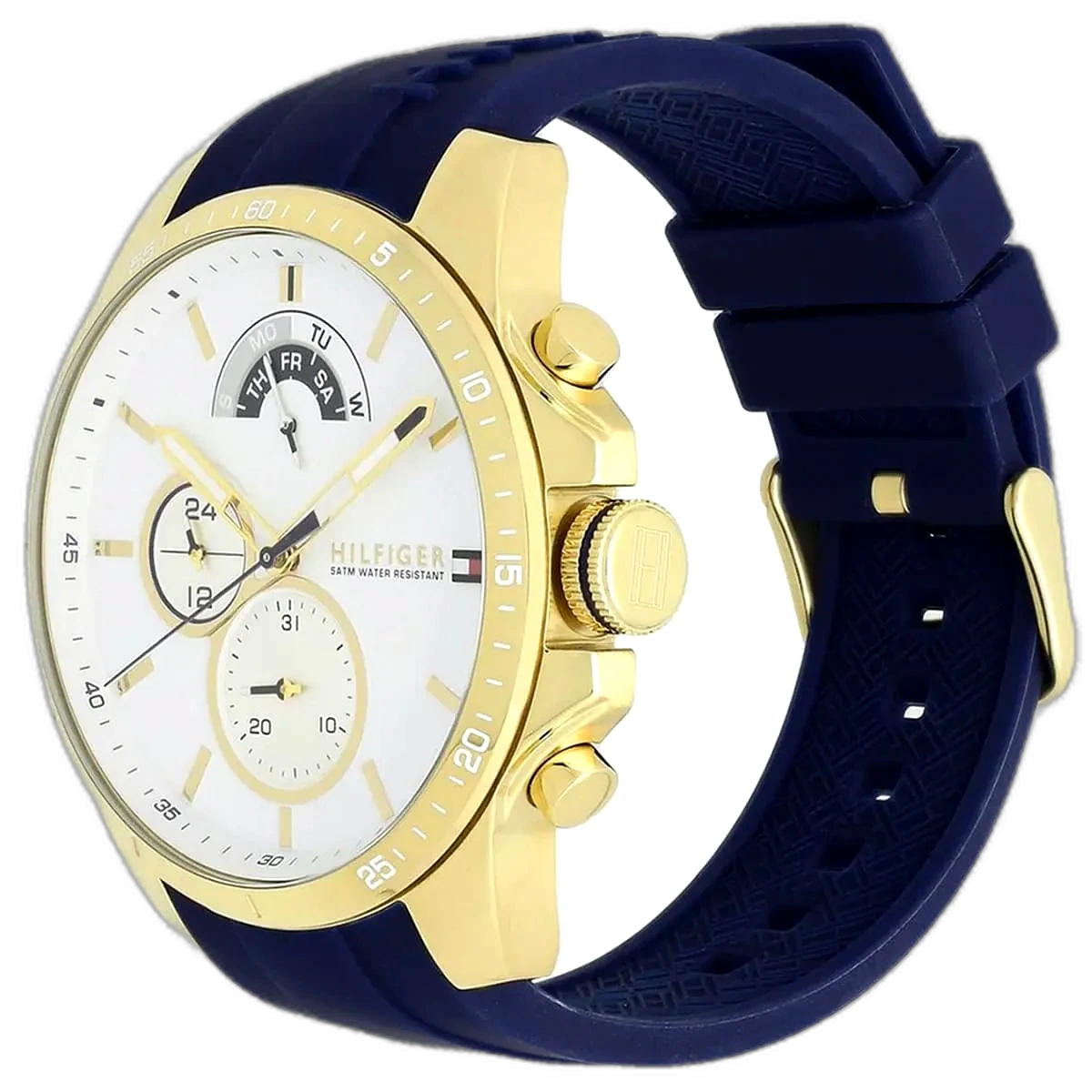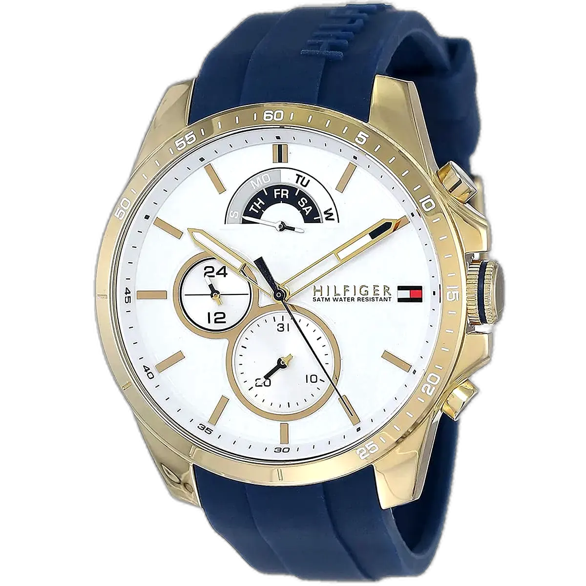 Embody modern American luxury with this original Tommy Hilfiger watch. This authentic timepiece, reference 1791353 (Decker model), features a vibrant white dial and a sporty blue silicone strap.