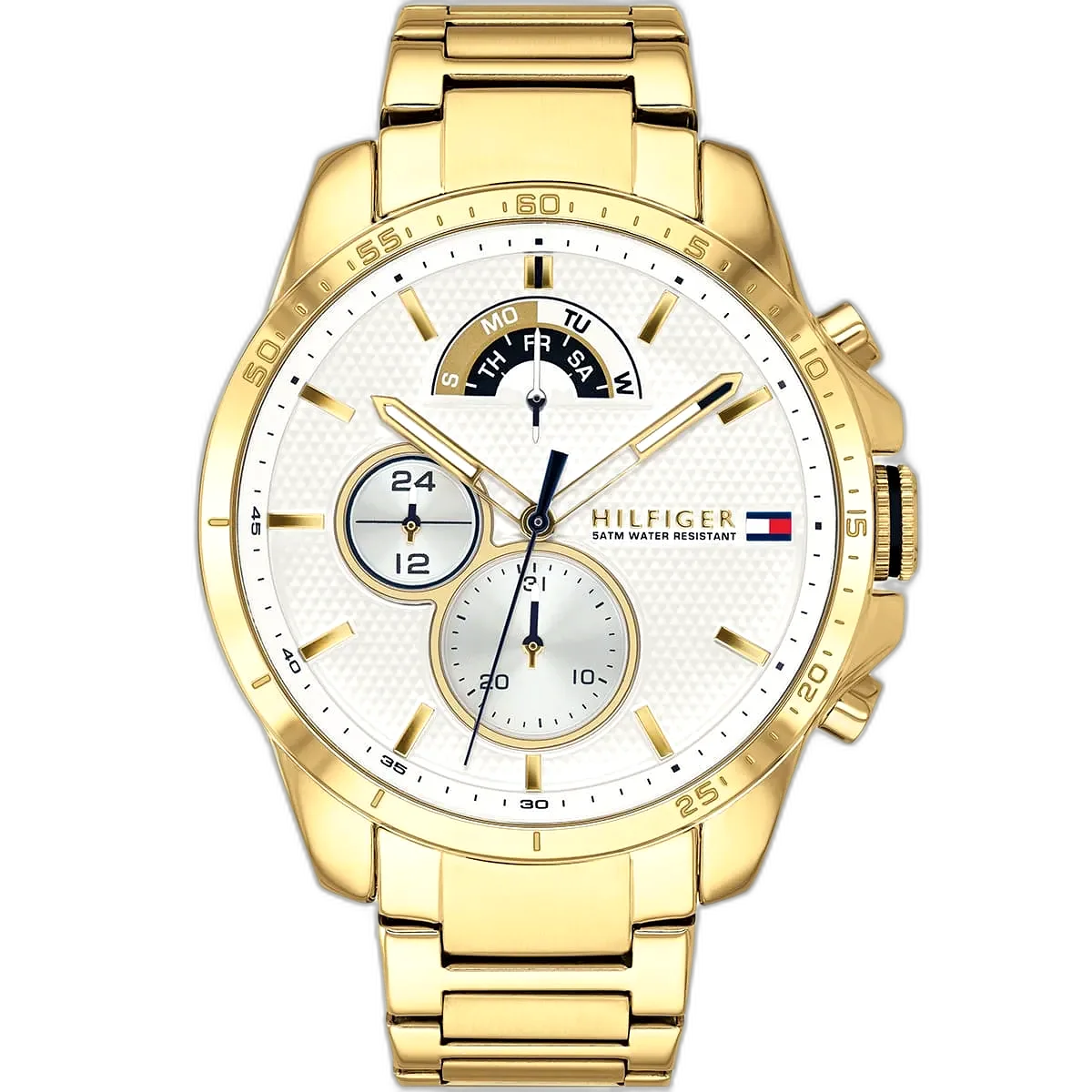 Step into the world of iconic American fashion with the Tommy Hilfiger Decker watch, a perfect blend of modern style and functionality. Renowned for its high-quality craftsmanship and distinctive designs, Tommy Hilfiger delivers with this authentic watch, reference 1791538 (Factory number TH.320.1.112.2586). With its crisp white dial and a luxurious gold-toned stainless steel strap, this timepiece offers a bold yet versatile look that is ideal for the modern man who values both style and durability. Its water resistance up to 50 meters ensures it can handle daily activities, including light swimming, though it is not recommended for deep diving or high-impact water sports. The watch features a multifunction quartz movement with three sub-dials, including day, date, and a 24-hour indicator, adding practicality and elegance to its dynamic design, making it a perfect companion for both professional and casual settings.