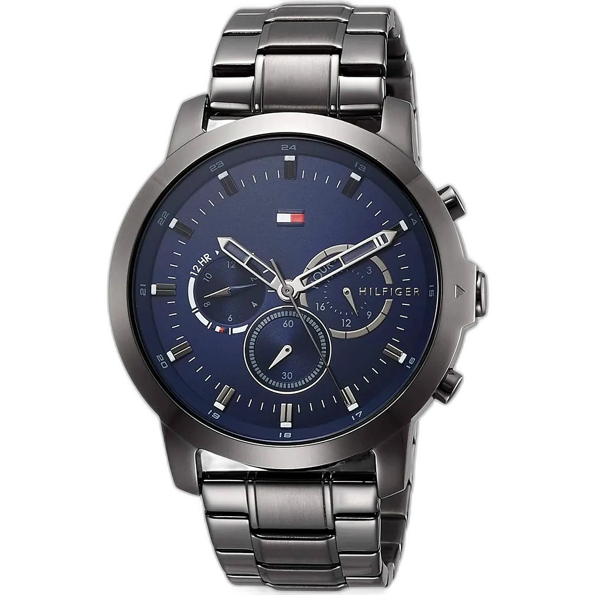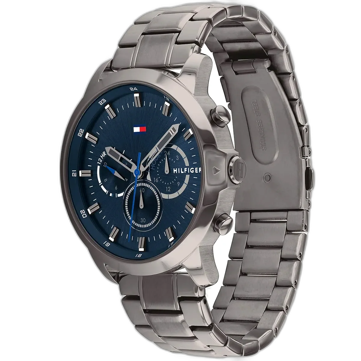 Embrace a sophisticated, modern look with this original Tommy Hilfiger watch. This authentic timepiece, reference 1791796 (Jameson model), features a striking blue dial and a sleek gray-toned stainless steel strap.