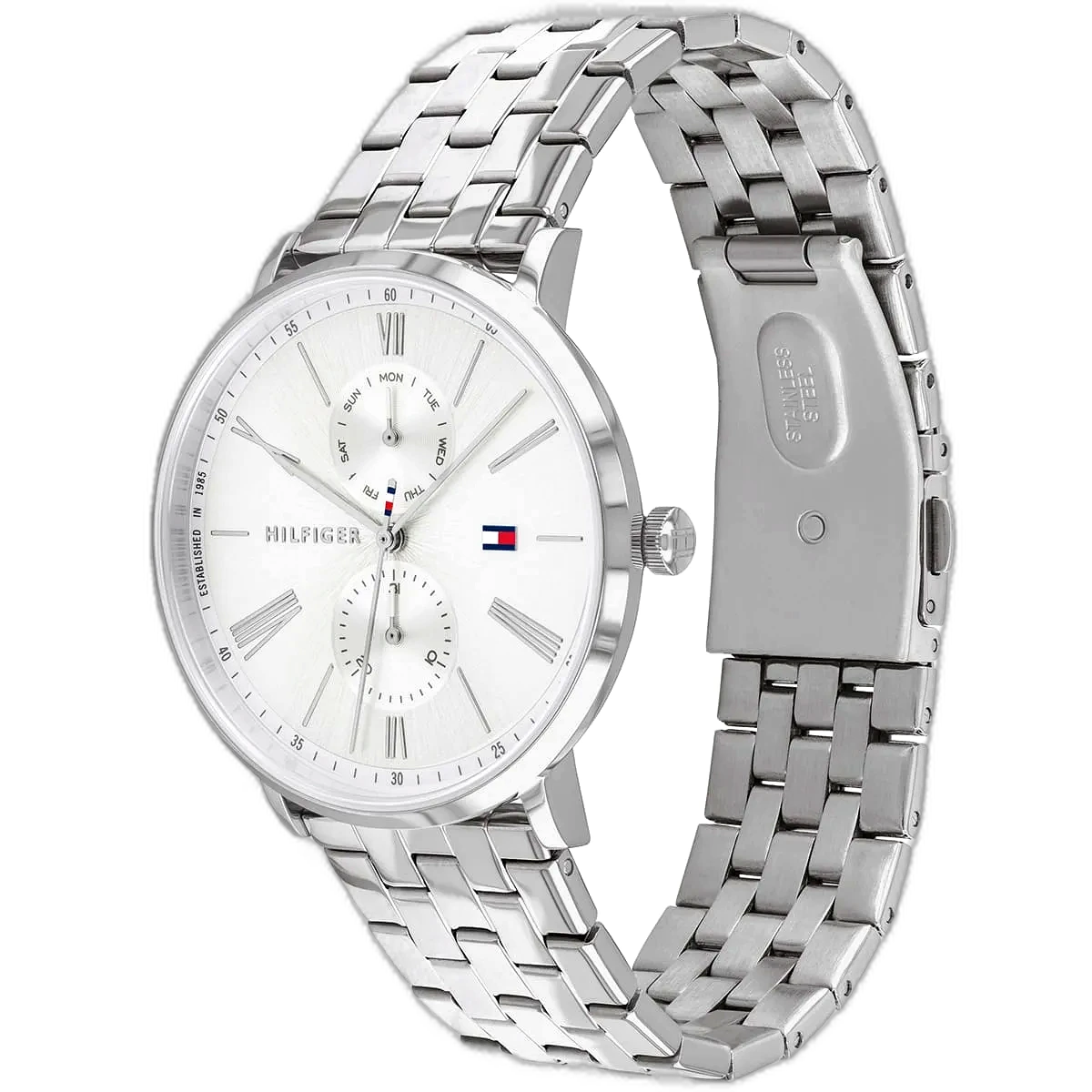 Embrace a sleek, modern, and minimalist look with this original Tommy Hilfiger watch. This authentic timepiece, reference 1782068 (Jenna model), features a sophisticated silver dial and a matching silver-toned stainless steel bracelet.