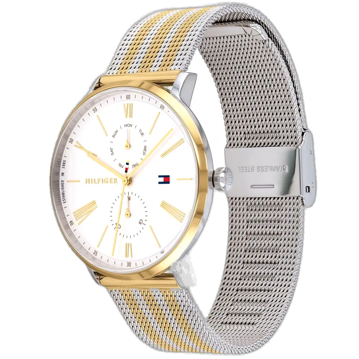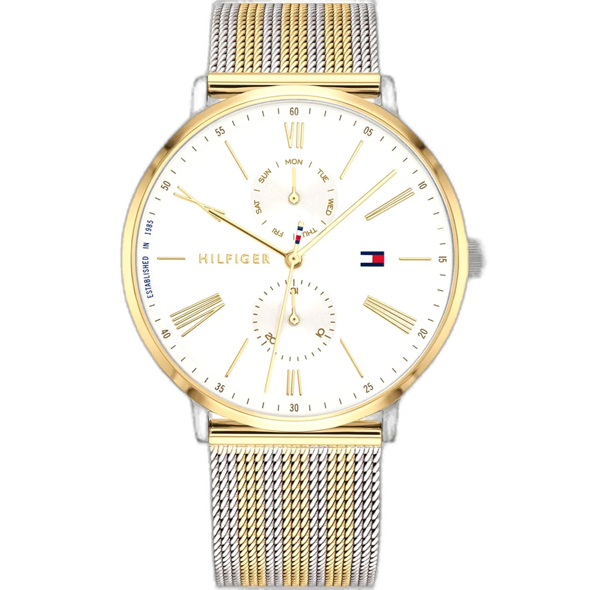 Make a bold and stylish statement with this original Tommy Hilfiger watch. This authentic timepiece, reference 1782074 (Jenna model), features a clean white dial and a stunning silver and gold-toned stainless steel bracelet.