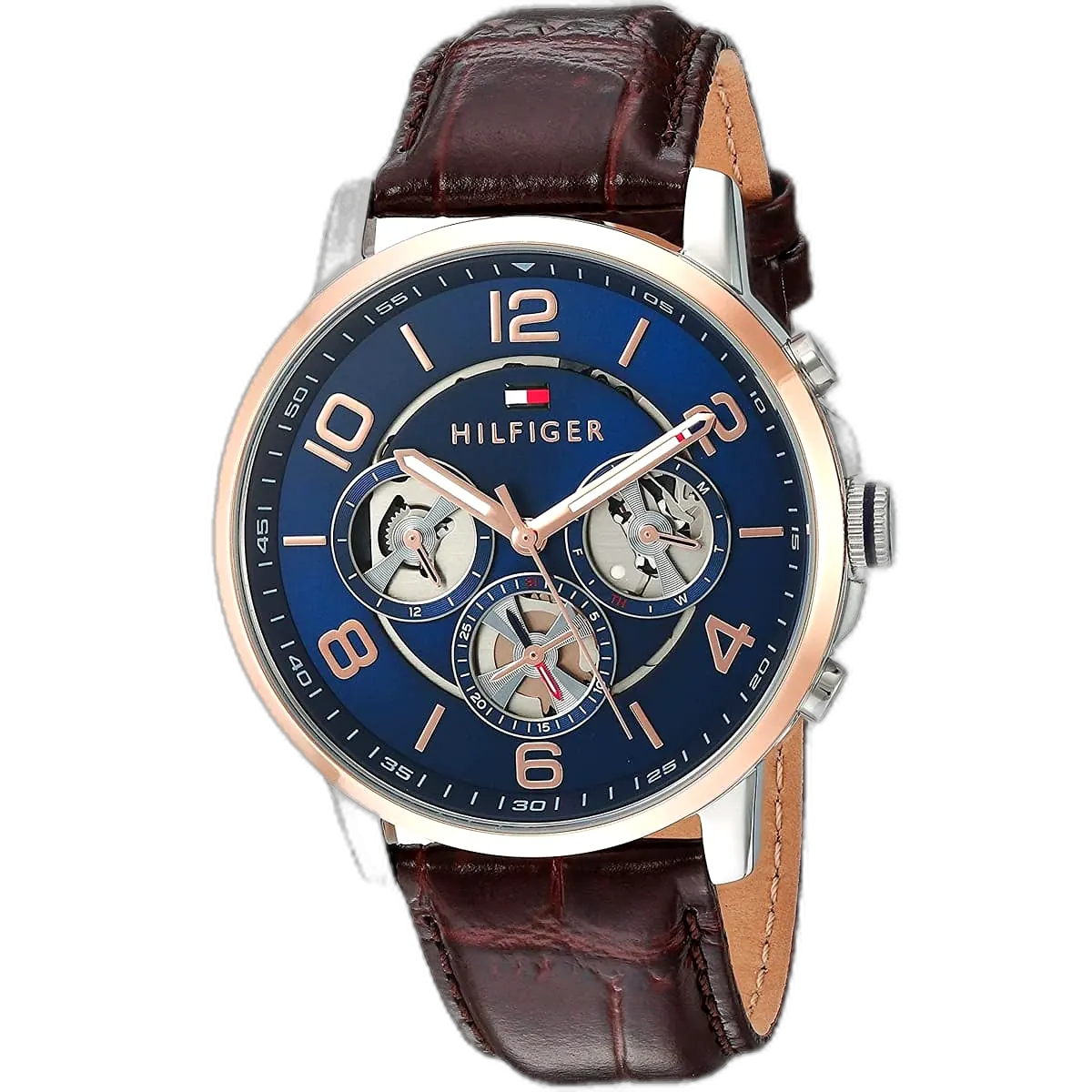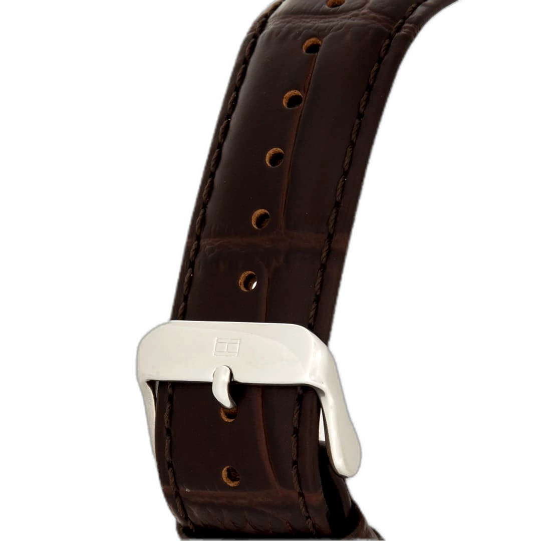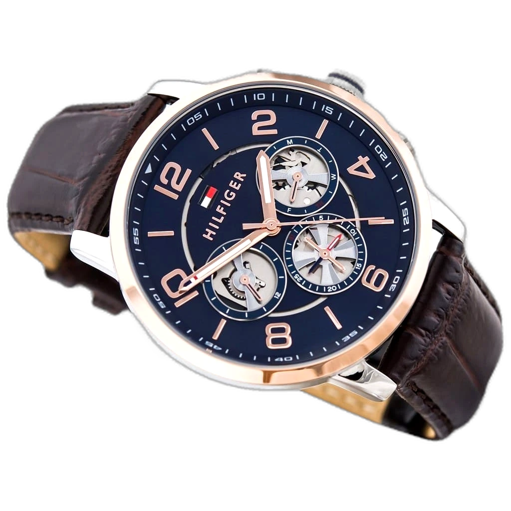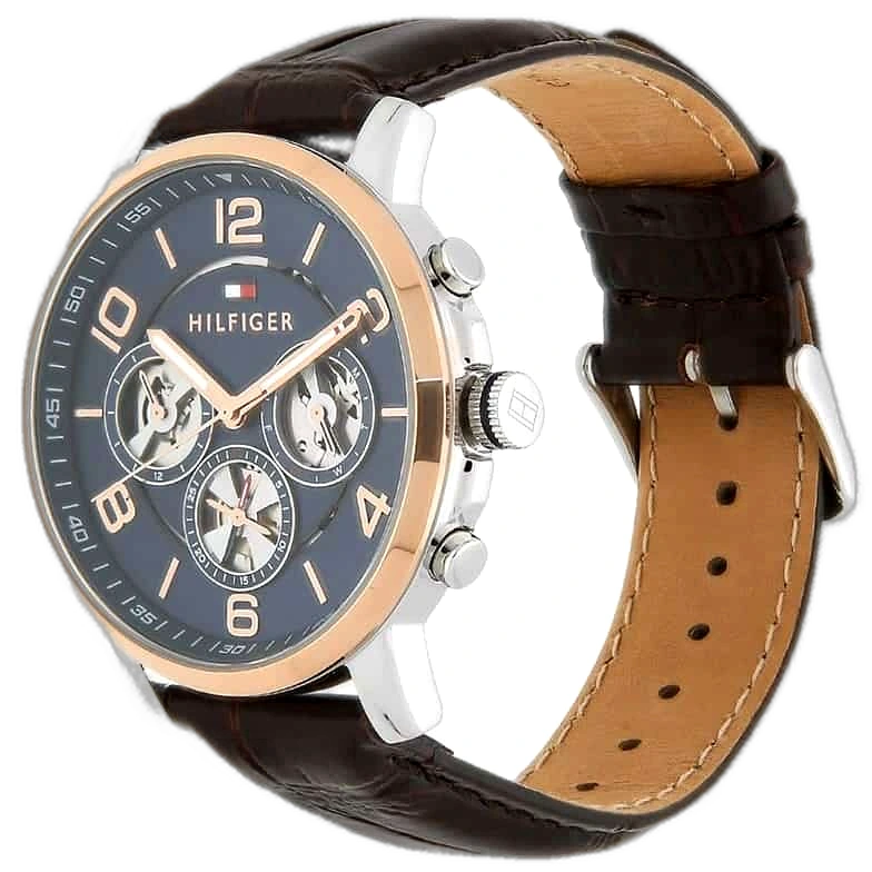 Embody modern American luxury with this original Tommy Hilfiger watch. This authentic timepiece, reference 1791290 (Keagan model), features a striking blue dial and a classic brown leather strap.