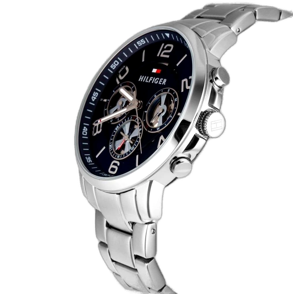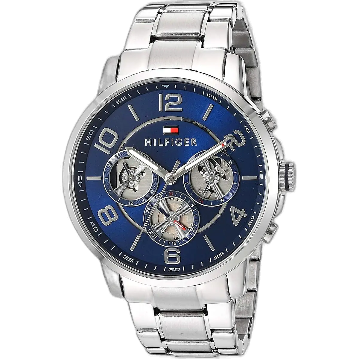 Step into the world of iconic American fashion with the Tommy Hilfiger Keagan watch, a perfect blend of classic elegance and modern sophistication. Renowned for its high-quality craftsmanship and distinctive designs, Tommy Hilfiger delivers with this authentic watch, reference 1791293 (Factory number TH.304.1.14.2099). With its striking blue dial and durable silver stainless steel bracelet, this timepiece offers a powerful and versatile look that is ideal for the modern man who values style and functionality. Its water resistance up to 50 meters ensures it can handle everyday activities, including light swimming, though it is not recommended for deep diving or high-impact water sports. The watch features a multifunction quartz movement with three sub-dials, including day, date, and a 24-hour indicator, adding practicality and elegance to its dynamic design, making it a perfect companion for both professional and casual settings.