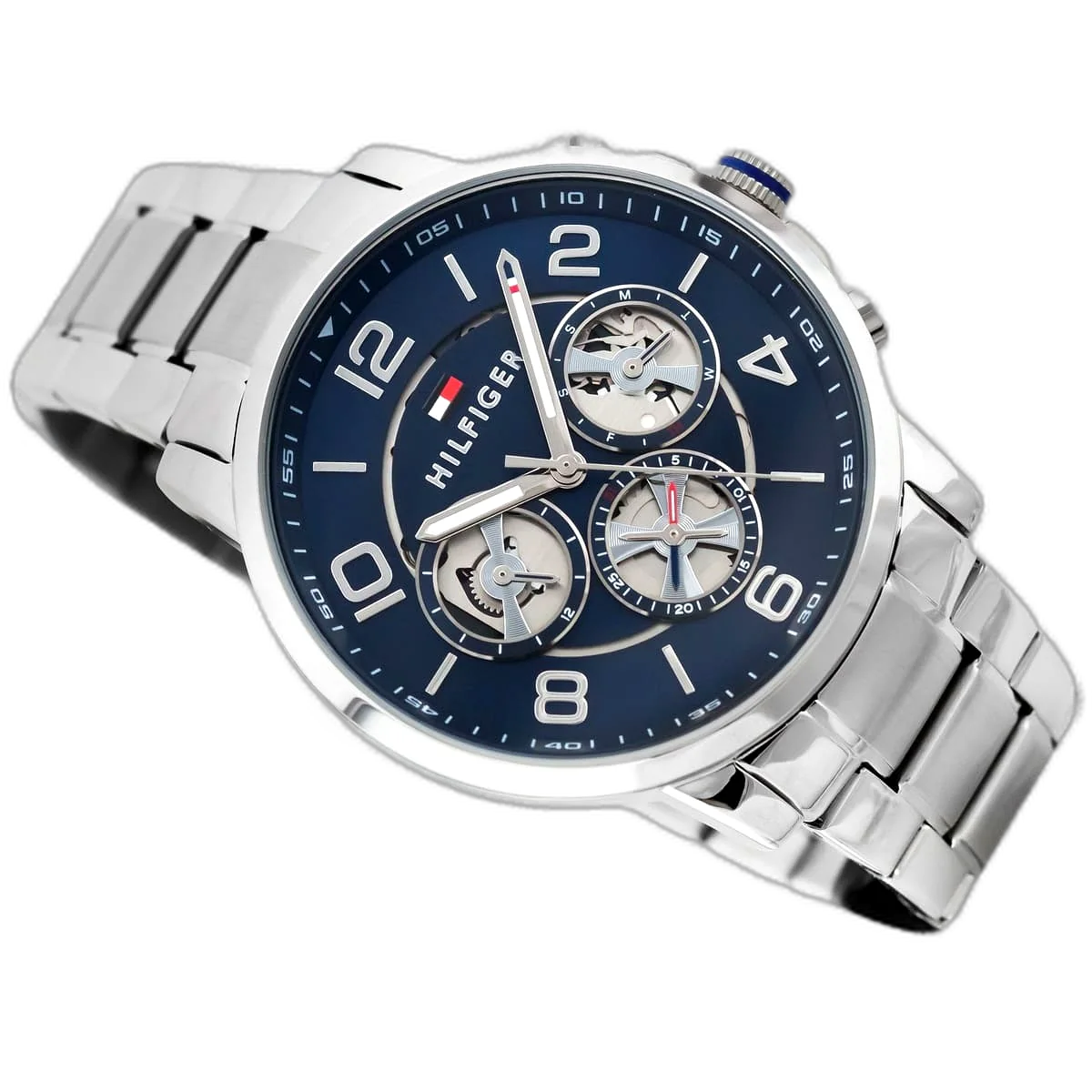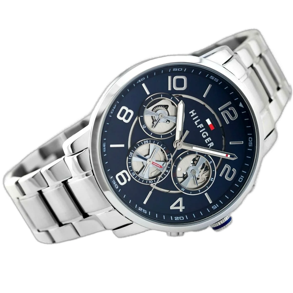 Embody modern American luxury with this original Tommy Hilfiger watch. This authentic timepiece, reference 1791293 (Keagan model), features a striking blue dial and a sleek silver stainless steel bracelet.