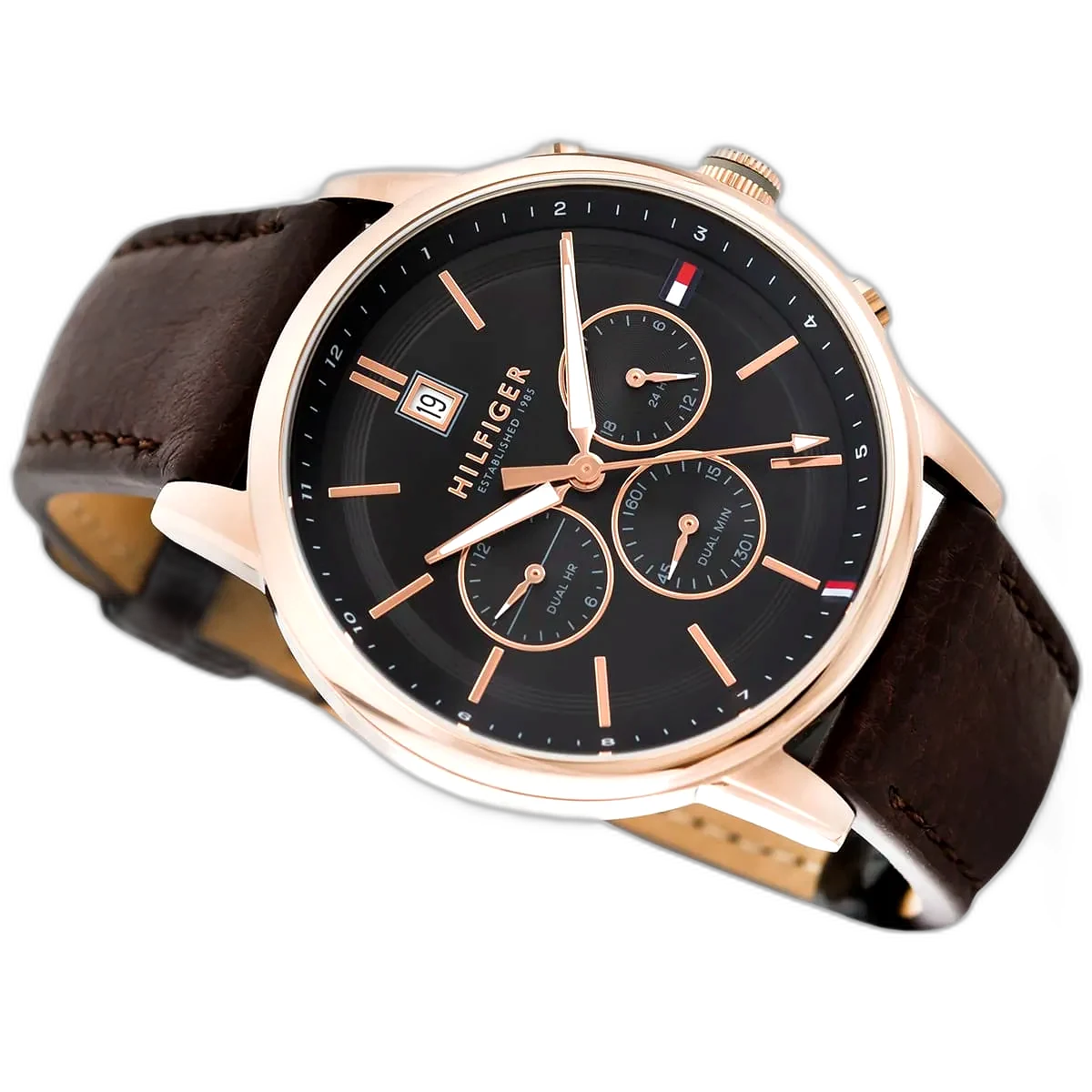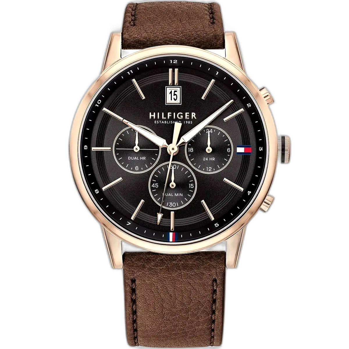 Embrace a classic, modern look with this original **Tommy Hilfiger** watch. This authentic timepiece, reference **1791631** (Kyle model), features a bold black dial and a traditional brown genuine leather strap.