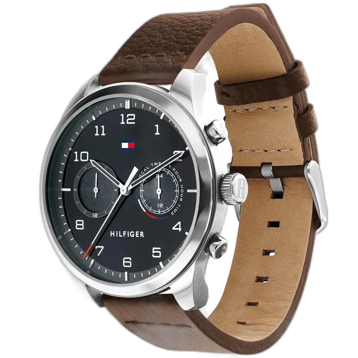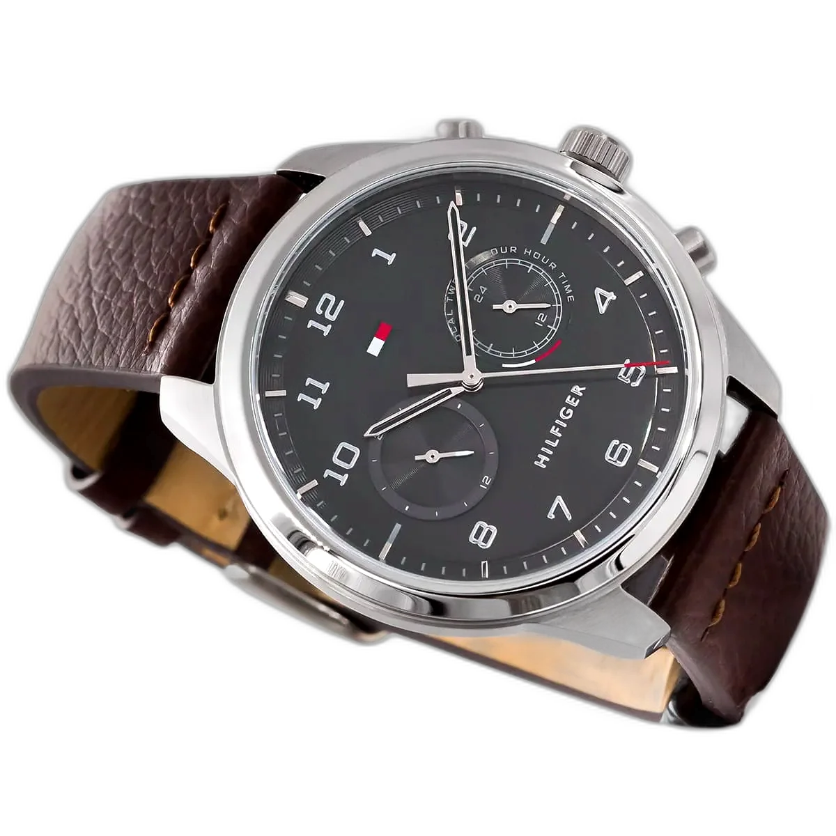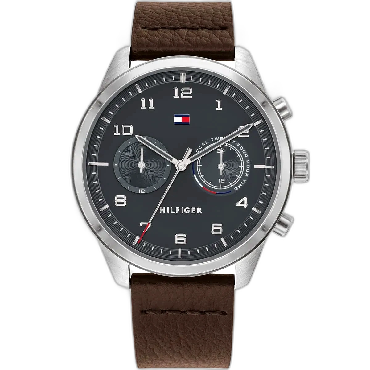 Embrace a sophisticated, classic look with this original Tommy Hilfiger watch. This authentic timepiece, reference 1791785 (Patrick model), features a refined gray dial and a rich brown genuine leather strap.